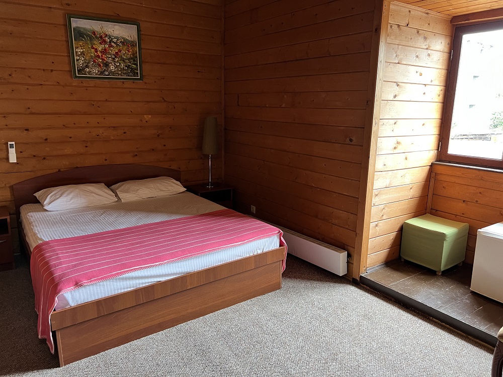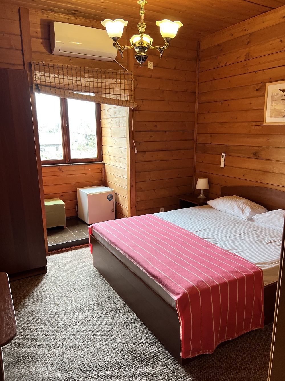Площадь номера - 16 кв.м. 2 осн. места. 1 доп. место. Балкон общий. Мебель: вешалка, зеркало, кровать двуспальная, прикроватные тумбочки, стол, стул, шкаф. Оборудование: кондиционер, телевизор, холодильник. Санузел: с душем, туалетные принадлежности. Сервис: смена полотенец, смена постельного белья, уборка номера.